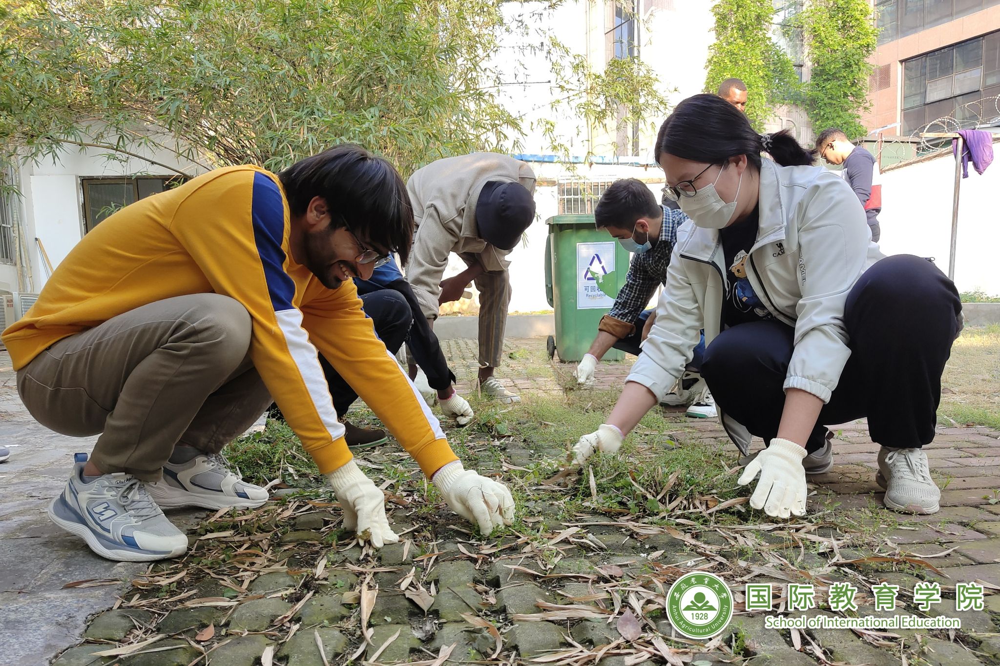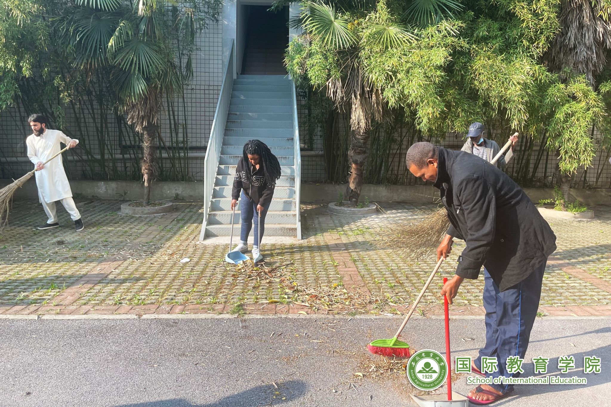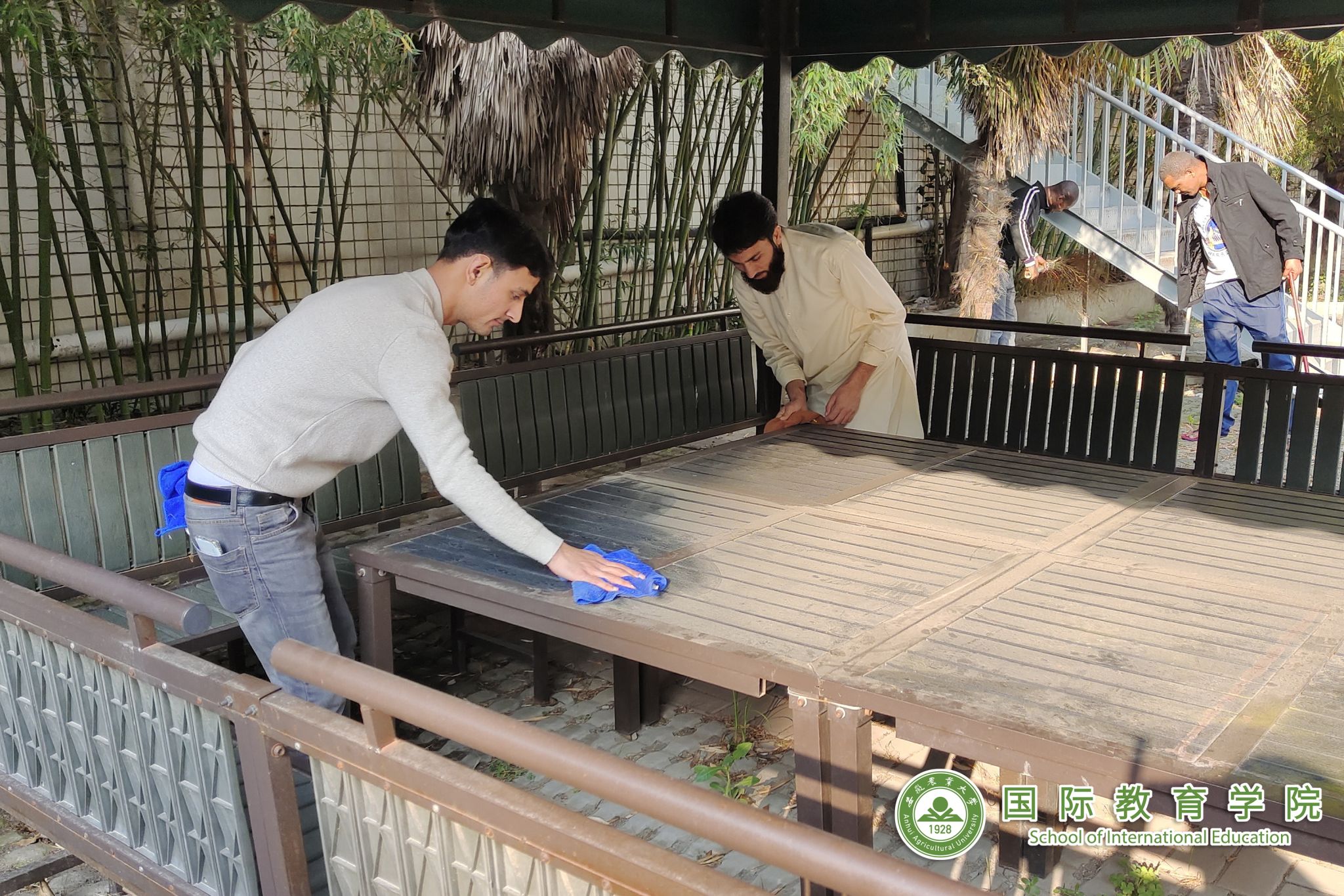 活动中,留学生们和老师们一起拿起扫帚、抹布等工具,分别承担起了垃圾清扫、杂草清除等职责,认真清理了国际教育学院留学生公寓周边的卫生死角和厨房卫生清理。师生们干劲十足,经过1个多小时的集中清扫后,留学生公寓环境焕然一新。