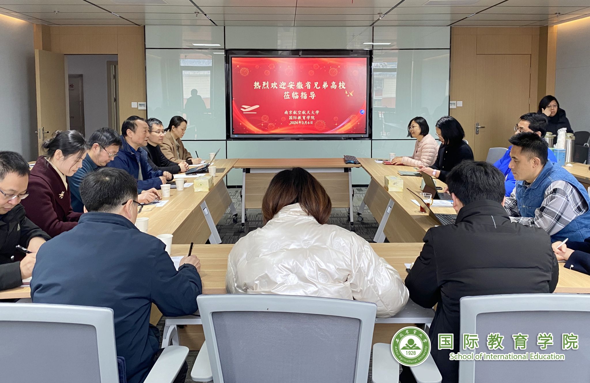 本网讯 近日,我校会同合肥工业大学、安徽工业大学赴南京航空航天大学国际教育学院进行调研交流。我校国际教育学院院长孙裴和副院长张华建等一行6人参加了本次调研,南京航空航天大学国际教育学院院长金泉元、副院长陈峰等相关工作人员出席了调研座谈会。