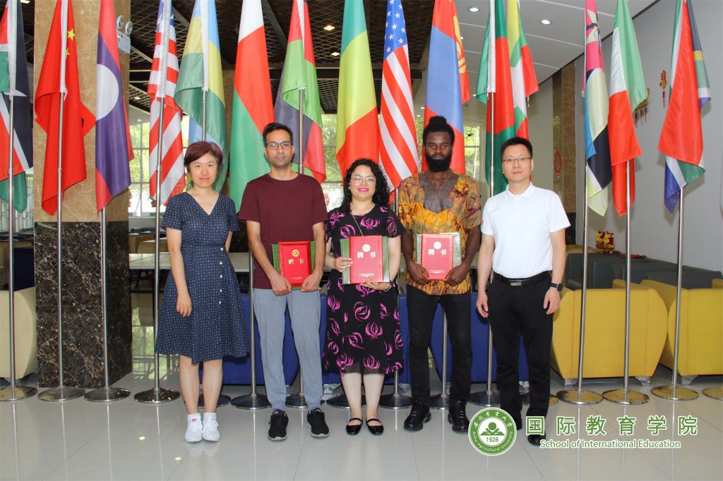 孙裴向国际学生顺利毕业表示祝贺,并向他们和家人表达了诚挚的祝福。祝福毕业生们今后的人生更加精彩,家庭美满,学习更上一层楼。随后他带领师生们共同重温了“习近平总书记给北京大学的留学生们的回信”讲话精神,希望同学们怀揣梦想和热情,继续前行,更加深入地了解真实的中国,同时把想法和体会介绍给更多的人,为促进各国人民民心相通发挥积极作用。各位毕业生们纷纷踊跃发言,表达自己的感激和不舍之情。巴基斯坦籍博士生HASSAN, MUHAMMAD AHMAD表示将“不忘初心、牢记使命”,铭记自己来中国的求学初心,继续努力学习,不辜负老师和同学们的期望,以后无论走到哪里,母校永远会在心中。