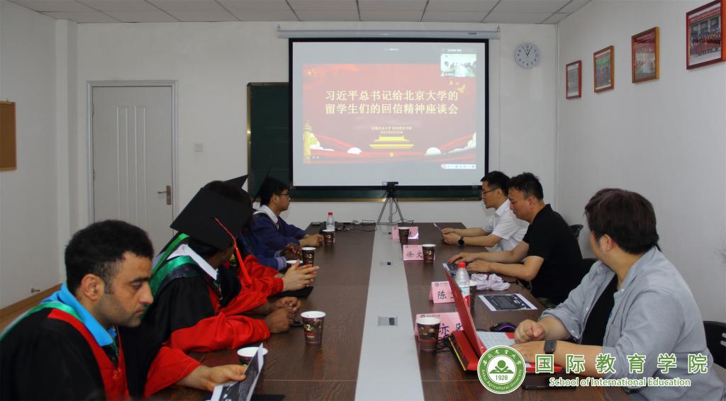 视频会上,孙裴代表国际教育学院对今年通过线上、线下答辩顺利拿到学位的同学表示祝贺。他对留学生们在疫情期间克服困难、努力学习的精神表示肯定和感谢;并代表国际教育学院,对所有毕业生之后的工作和学习表示祝福,希望同学们在下一阶段的工作和学习中,能通过自己的知识和家人共同克服学习和工作上的困难,取得新的成功。最后,他带领同学们共同学习了“习近平总书记给北京大学的留学生们的回信”。同学们备受鼓舞,反响强烈。