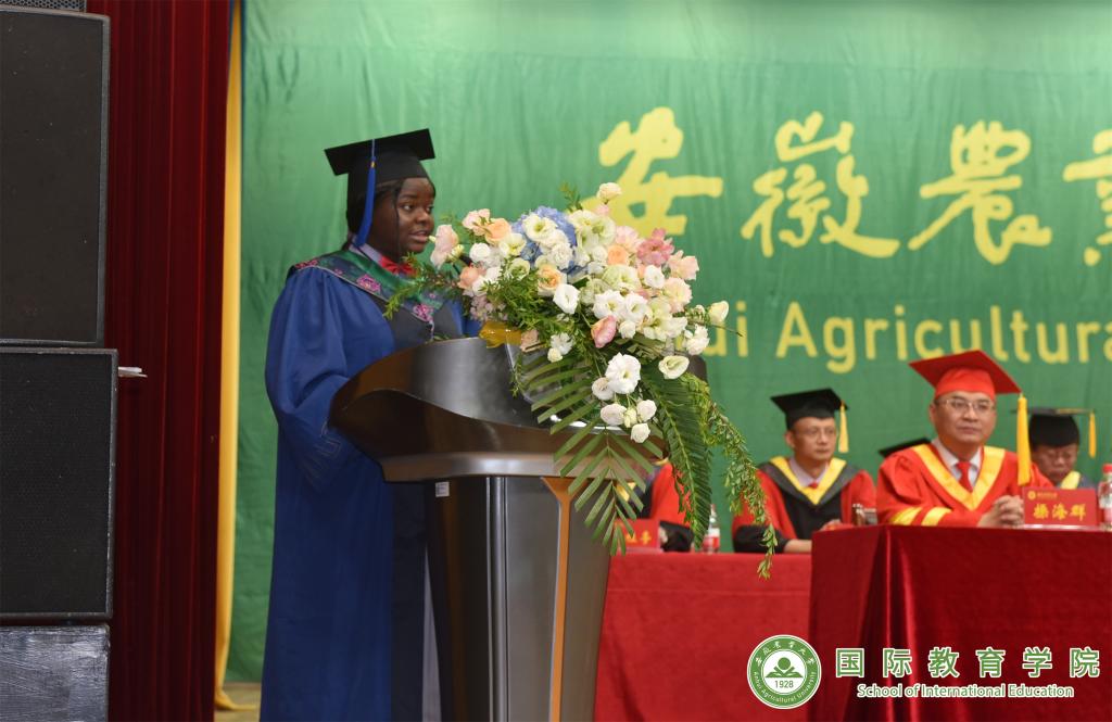 上午8:30,境内毕业生代表这届全体毕业留学生(境外毕业生通过线上观看现场直播),身着学位服,有序来到学校大礼堂,参加学校毕业典礼。来自刚果布的硕士留学生JESSICA MAGUY(杰西卡)作为留学生代表发言,她感谢所有帮助她的老师和同学们,希望把在中国学到的知识,应用到今后的工作和生活中去,把在身边发生的中国故事,讲给身边的朋友听。校领导为毕业生代表授予学位。大家合影留念。