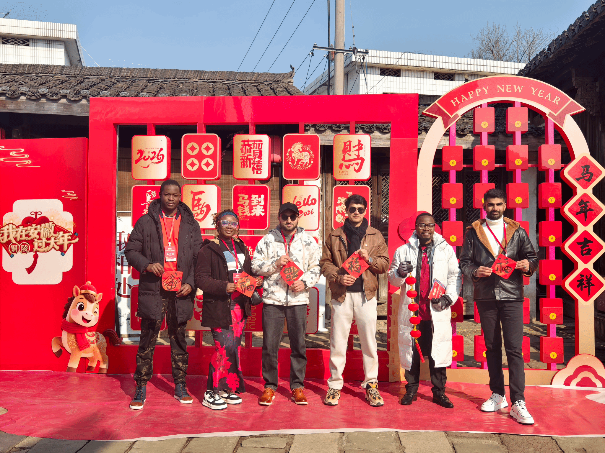 1月23日,由安徽省人民政府外事办公室(省港澳事务办公室)与铜陵市人民政府联合主办的“我在安徽过大年”中外友人2026年春节联谊活动在铜陵市犁桥水镇举办。学校积极组织留学生代表参与活动,与来自全球59个国家和地区的140余名外籍友人、港澳同胞齐聚一堂,于粉墙黛瓦的徽派古镇中沉浸式体验中国年俗,共品徽风皖韵,同庆新春佳节。我校乌兹别克斯坦籍留学生乔菲受邀担任本次联谊活动主持人,以流畅表达展现中外青年交流风采。