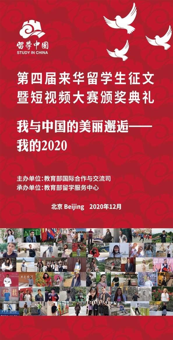 2020年12月8日,第四届来华留学生征文暨短视频大赛颁奖典礼以线上形式成功举办。此次活动由教育部国际合作与交流司主办,教育部留学服务中心承办。教育部国际合作与交流司副司长方军、教育部留学服务中心副主任杨凌出席该活动。